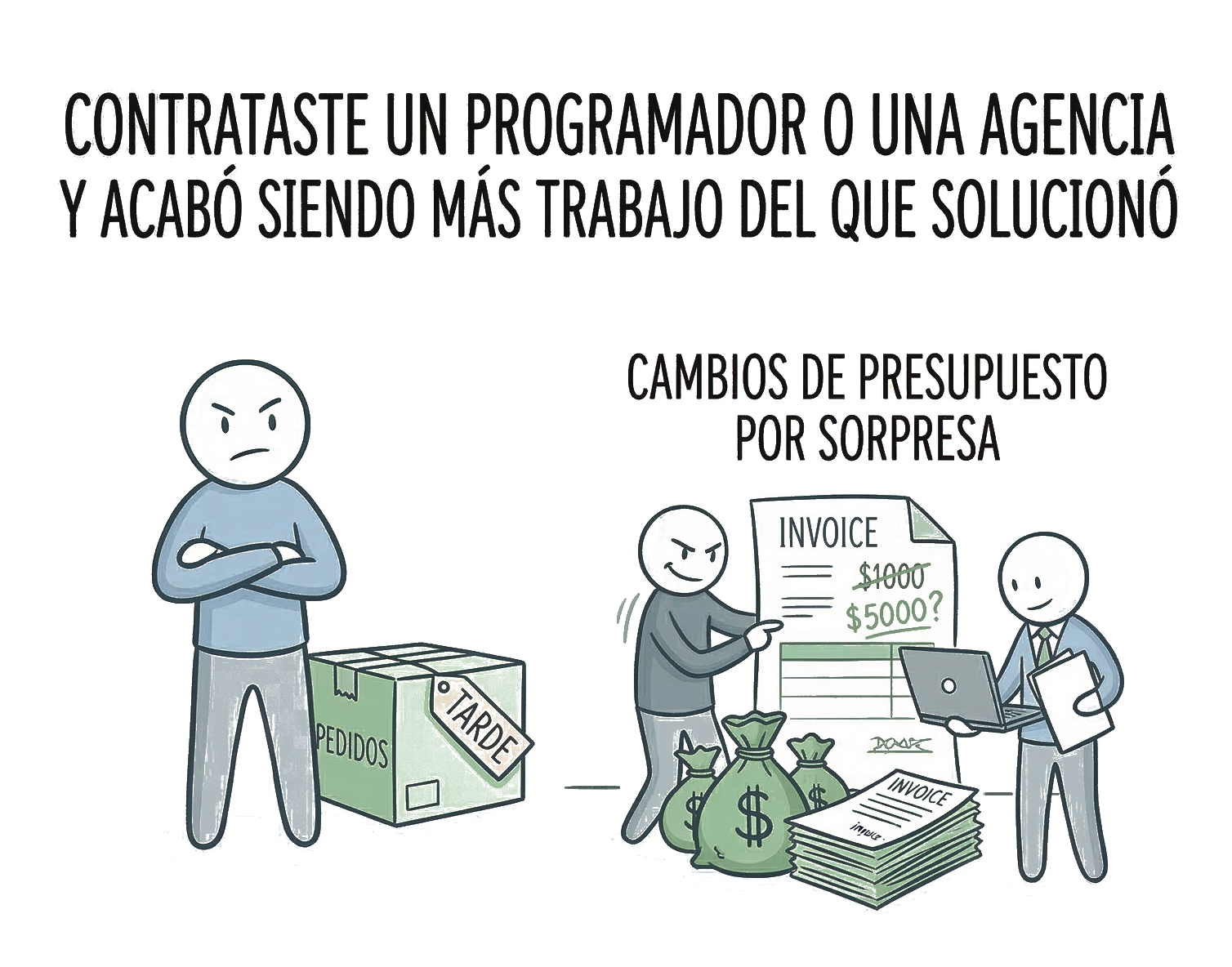 | Cambios de alcance | Cada cambio es un presupuesto nuevo | Sin coste. Redefinimos prioridades cada 2 semanas |